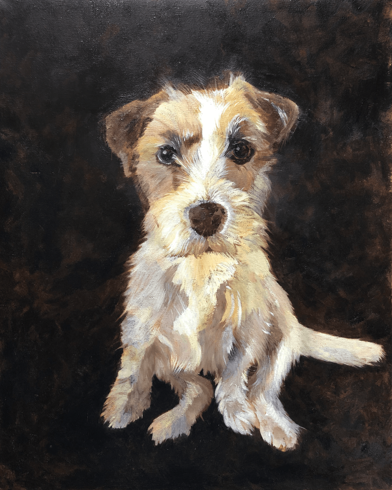 Dieren portret. Op aanvraag. zoals dit Olieverf schilderij van de vrolijke ruwharige 'Jack Russel', Puck.